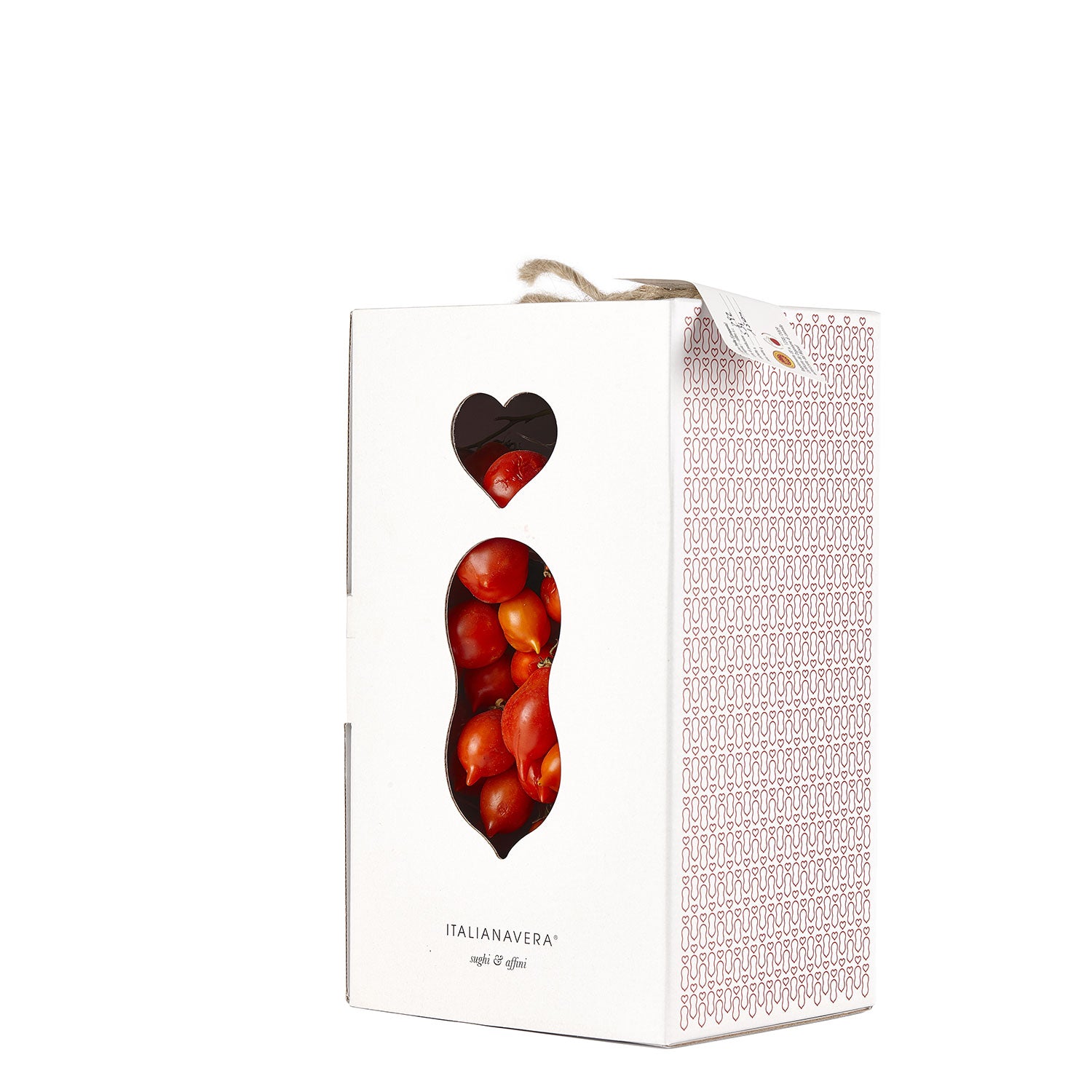 Italianavera propone questo pomodoro in una confezione in box che richiama la storica conservazione “a piennolo”, reinterpretata in chiave contemporanea senza tradirne il senso originario.